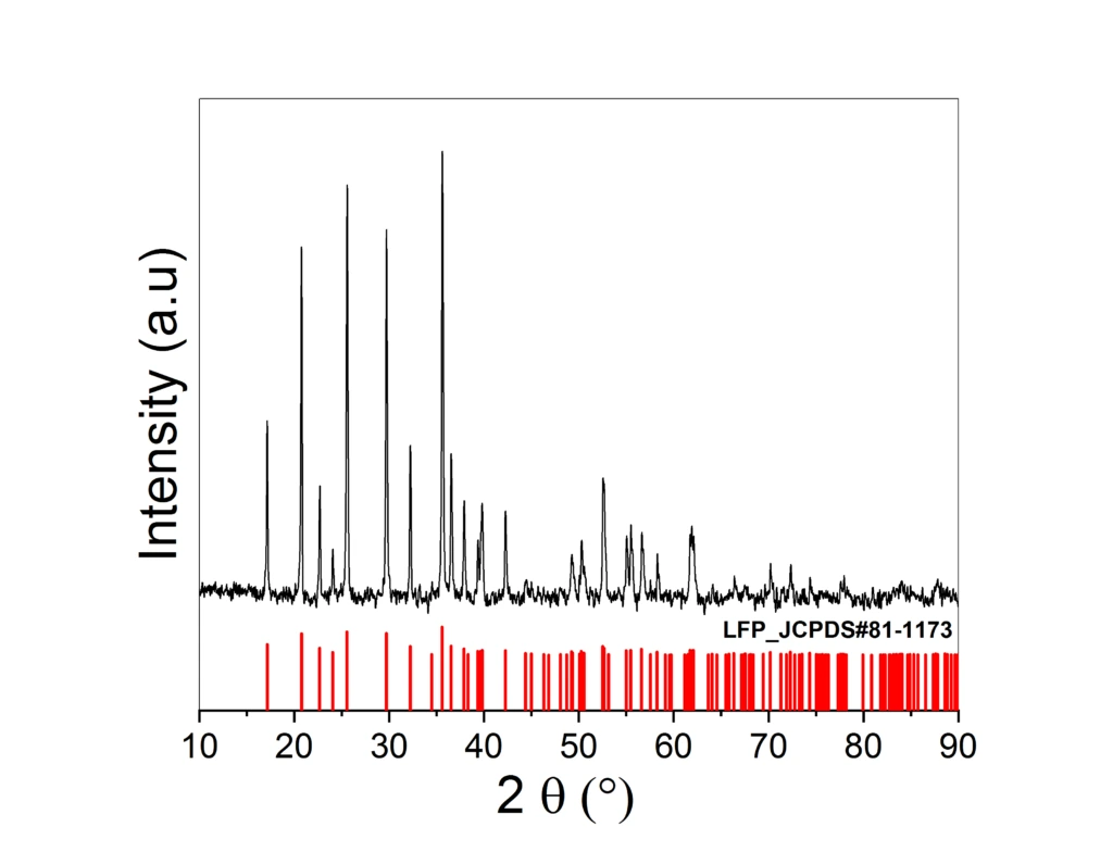 Fig.1 shows the X-ray diffraction (XRD) pattern of LiFePO4/C prepared in Starz Energies lab. The experimental data can be indexed to single olivine phase with a Pnma space group, without signs and traces of impurities (JCPDS81-1173).